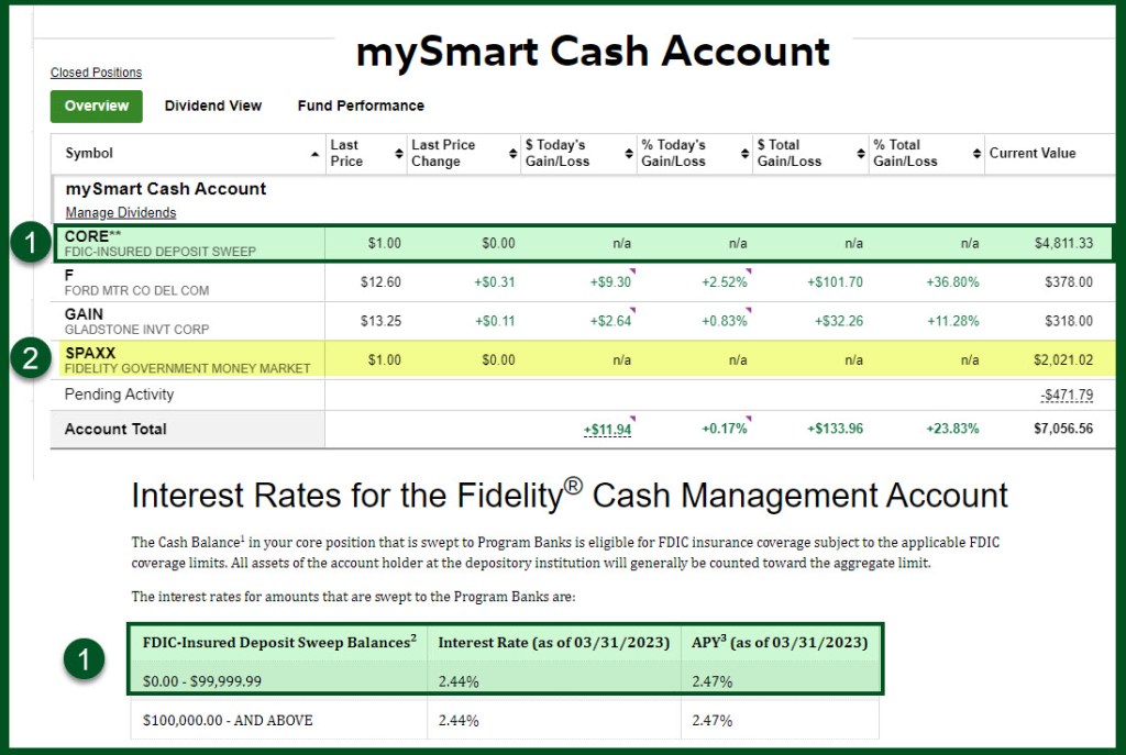 Our Fidelity checking account has four investments: CORE, F, GAIN, and SPAXX