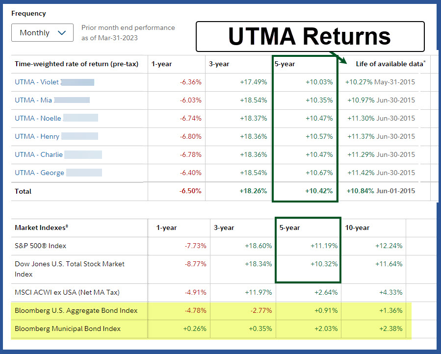 Over the last seven plus years Cindie and I have given a total of $24,119.28 to our children’s children. The total current balance is $44,130.07. Therefore, the value of the $24K has grown $20K. This was easy income because it required very little effort on my part. The five-year return has been about 10%, which is far better than any bank savings account or CD might pay. It is certainly far better than any bond investment can ever be.