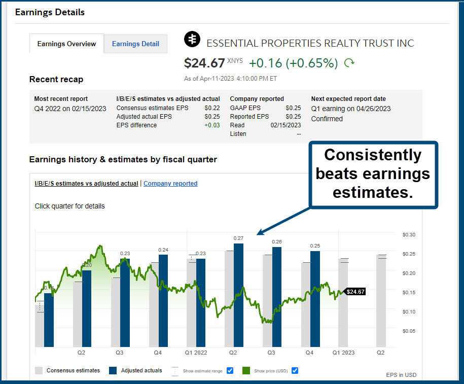 Essential Properties Realty Trust, Inc., a real estate company, acquires, owns, and manages single-tenant properties in the United States. The company leases its properties to middle-market companies, such as restaurants, car washes, automotive services, medical and dental services, convenience stores, equipment rental, entertainment, early childhood education, grocery, and health and fitness on a long-term basis. As of December 31, 2022, it had a portfolio of 1,653 properties. The company qualifies as a real estate investment trust for federal income tax purposes. It generally would not be subject to federal corporate income taxes if it distributes at least 90% of its taxable income to its stockholders. The company was founded in 2016 and is headquartered in Princeton, New Jersey.