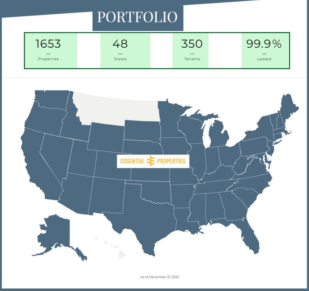 “EPRT is a self-managed REIT that owns and manages single-tenant net leased properties with long-term leases. At present, it has a portfolio of 1,653 freestanding net lease properties and is well diversified by geography, with a presence in 48 states. What sets EPRT apart from its net lease peers such as Realty Income (O) and National Retail Properties (NNN) is its sale-leaseback focus on the middle market, a sector that’s highly fragmented with smaller regional tenants. This usually comes with higher cap rates due to lower competition from institutional players.” SOURCE: Seeking Alpha