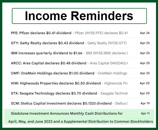 Life is full of forgetting. Even long-term investors can look at their results for the year and start to question their success. One way I am reminded of my strategy and focus is by receiving dividend announcements for stock and ETF positions in our accounts. Here is a sample of nine different recent dividend announcements, including PFE, GTY, IBM, ARCC, OMF, HIW, STX, SCM, and GAIN.