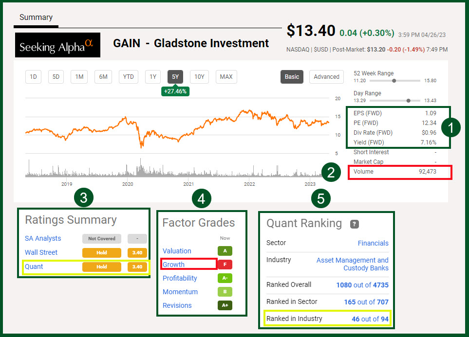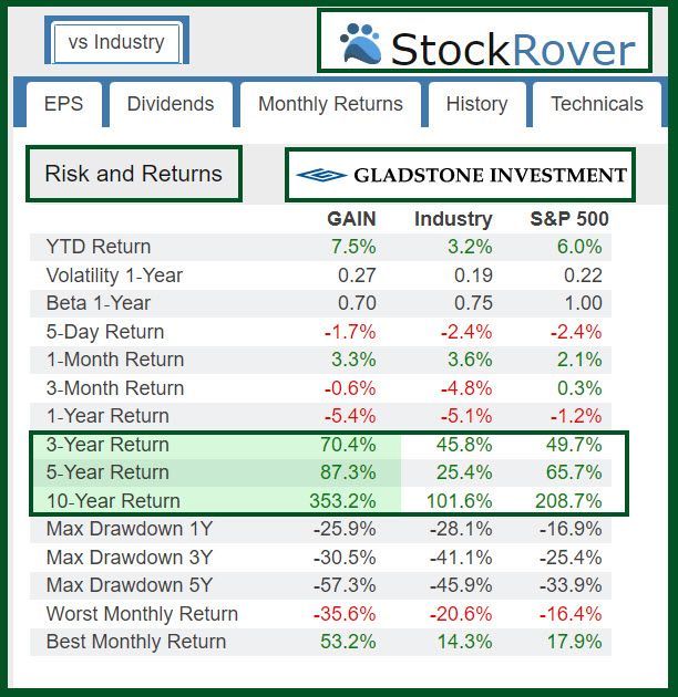 When it comes to investment returns there are always three pieces to remember. The first piece are the dividends you have already received. This is a bird in the hand that cannot fly away. The second piece is the growth in the value of the investment. If you can eventually sell the shares for more than you paid for them, you have a return on your investment. Finally, always remember that there are costs in the equation. Therefore, always seek to minimize your ETF costs that eat away at your returns. GAIN has a good ten-year return based on the following data from StockRover.