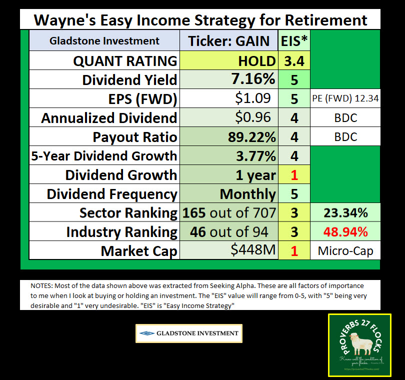 GAIN qualifies for my Easy Income Strategy (EIS), but it is not for everyone. First of all, it is best to focus on good dividend growth ETFs. Investments like GAIN should only be added to supplement your entire portfolio and GAIN should never be more than five percent of your total portfolio. In our case, GAIN is a large holding, but it is no where near five percent of the total.