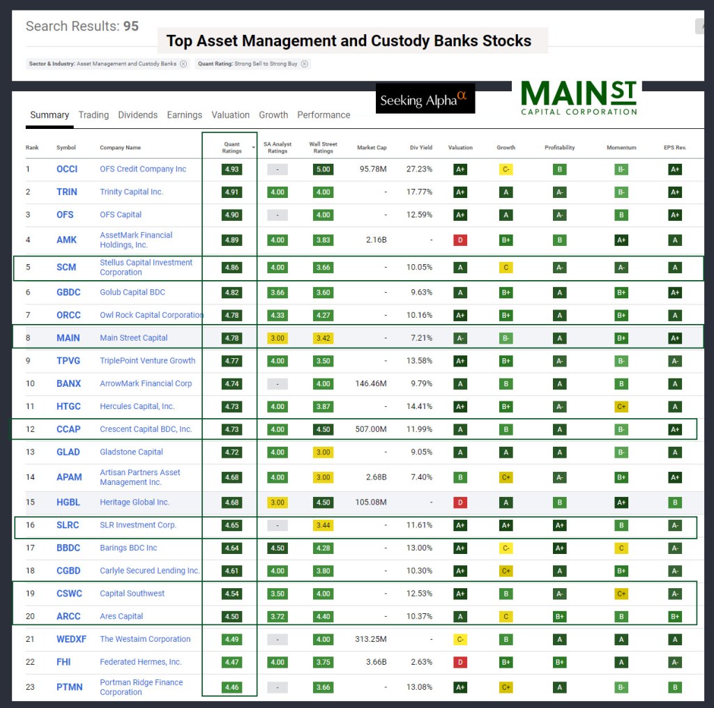 By now my readers know that I look at things like the Seeking Alpha QUANT Rating, and the ranking of a business by sector and industry. Several BDCs in our portfolio are in the top twenty BDC investments by QUANT score. They include SCM, MAIN, CCAP, SLRC, CSWC, and ARCC. Seeking Alpha makes it easy to spot some winners and to avoid the losers.