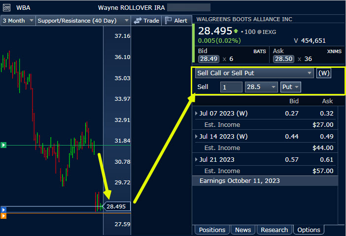 Now we have to wonder, how low can it go? I wish I knew, but I will admit that I am now tempted to buy 100 shares or to sell a cash covered put option on WBA shares. If I sold one put option, that expires on Friday, July 7, I could get an immediate payment of about $27.  Of course, if the shares drop to or below $28.50 at the market close on Friday, I am committed to buying one hundred shares of WBA for $2,850. Bear in mind, however, that my cost basis for the shares would be $28.23, because I earned $0.27 per share in selling the put.