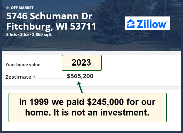 I think it is erroneous for most people to consider their home an investment. It is an asset, but that asset value is usually reduced by the mortgage. Our home is mortgage-free now, so, according to Zillow, our home is worth $565,200. We paid $245,000 for this property in 1999, so it is worth more than we paid for it.