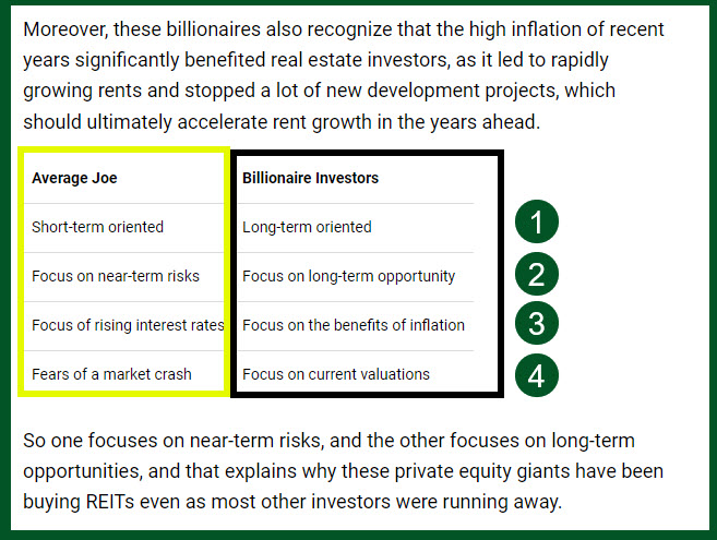 As you can see, his hypothesis is that we should (perhaps) follow the money. If billionaires are investing in real estate, then it can make sense to consider REITs. Furthermore, it makes sense to buy real estate if you are a long-term investor. I like the way he compares the “Average Joe” with the “Billionaire Investors.” Billionaire investors are not typically day-traders, and they don’t let the market’s gyrations dictate their behaviors.