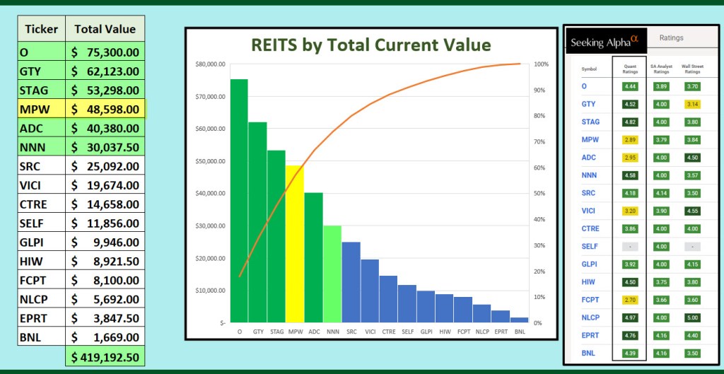 This is a total of all of the REITs in all accounts. I used an Excel Pivot Table to produce this view. I also added the QUANT ratings from Seeking Alpha. I plan to buy more shares of NNN.