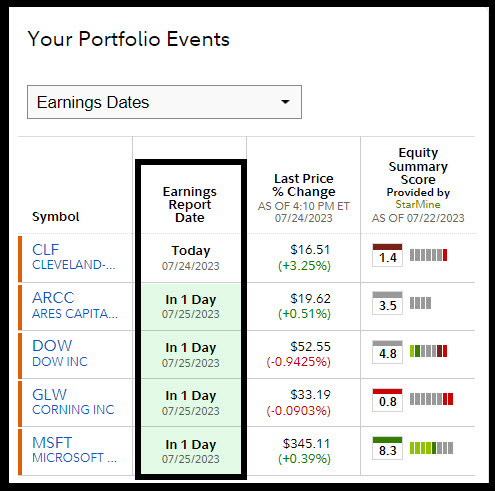 Another way to get information like this on all of your positions is by using Fidelity’s Active Trader Pro. A download of your positions from that software will show you all of the earnings and dividends dates for all of your positions. Those can be sorted in Excel, if you are comfortable with using Excel.