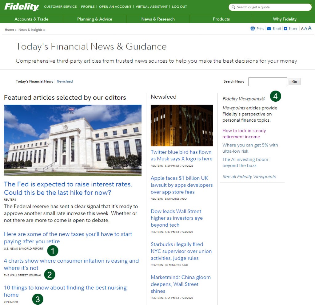 Another quick way to get news is on Fidelity. One of the benefits is that they have news and articles selected from other sources like U.S. News & World Report, Reuters, The Wall Street Journal, and Kiplinger. Some of these can be helpful depending on your life and upcoming events, like retirement. I also like some of the Fidelity Viewpoints. You can see that I clicked on “How to Lock in Steady Retirement Income.” The idea is to continue to learn and be alert.