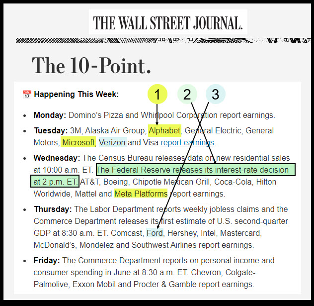 The following image helps illustrate how I read the news. Every morning I receive an email from the WSJ that is “The Ten-Point.” I don’t have the time or interest to read the entire journal, even though I could if I wanted to consume more news. The ten point distills the key suggested news or events of the week. In the following illustration I highlighted three that caught my eye: Yellow, Green, and Blue.