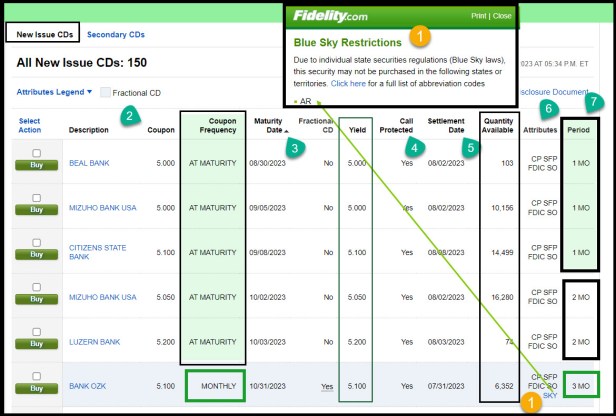 “SKY” is probably the most important flag to notice. There are some CDs that cannot be purchased in some states. “The registration of new issue securities with the state agency that reviews selling documents for accuracy and completeness. When seen as an attribute (“SKY”) in a CD Results table or Details page, the phrase is used to point out those states that have Blue Sky Laws that prohibit the marketing and sale of that security to customers residing in that state.” – SOURCE: Fidelity Investments. In this example, the BANK OZK CD is not available for residents of Arkansas.