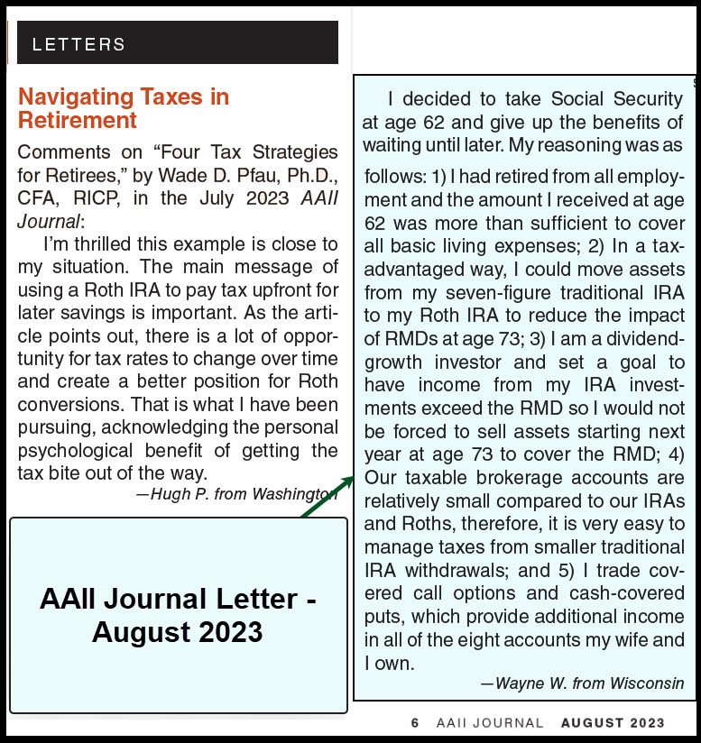 I wrote a letter to the editor of the AAII Journal. The topic was “Navigating Taxes in Retirement.” They published my response in the August AAII Journal. Here it is: