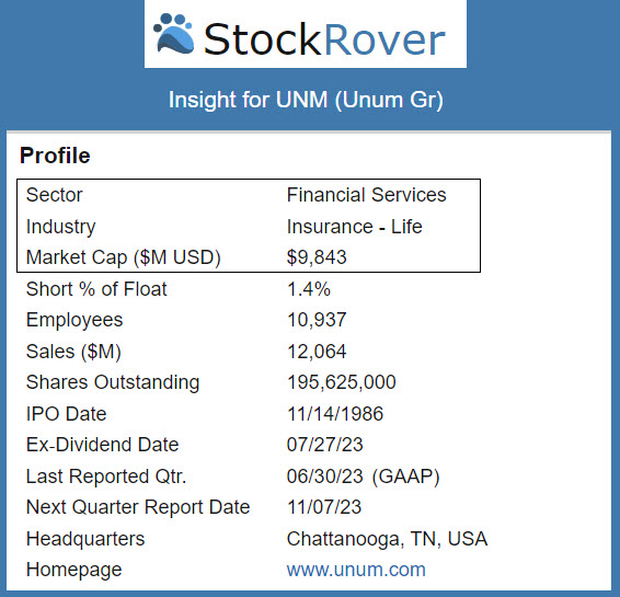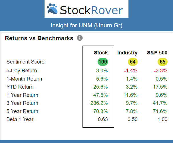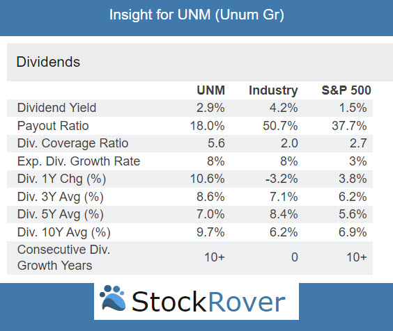 UNM has a history of increasing dividends. Seeking Alpha says there have been 14 years of dividend increases and the 5-year rate for the increases is 7.36%. The dividend payout ratio is below 20%, so that makes the dividend attractive and reasonably safe. For comparison purposes, here are some images from StockRover.