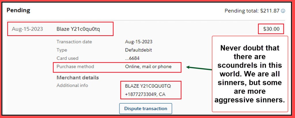 Yesterday, after returning from Montana, I noticed a charge for “BLAZE.” After checking with Cindie to see if she had made an online purchase, I began the process of disputing the charge. Fidelity closed that account number yesterday, and UPS is delivering a new set of cards today.