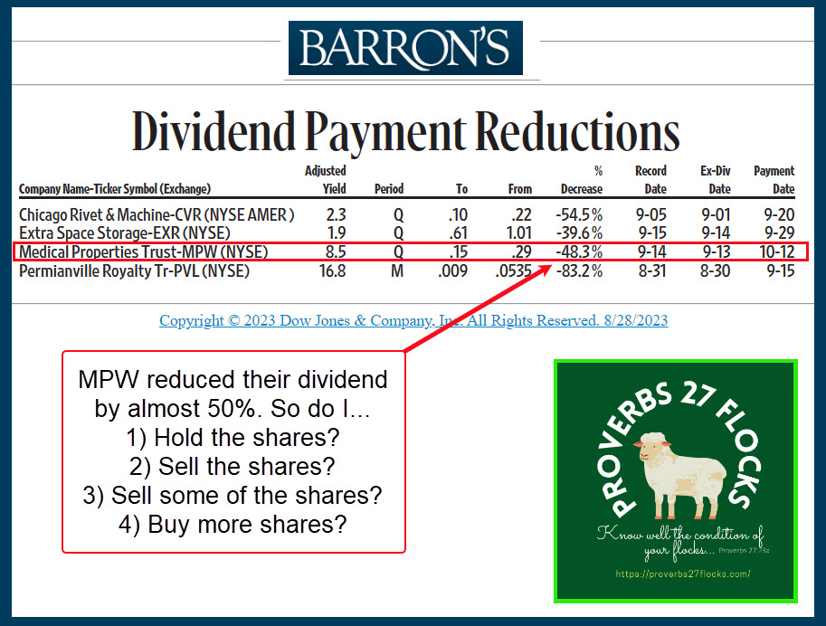 Now, I said all of that to address the reason for this post. The title of this post is, “When The Dividend Drops or Ceases.” The reason for this post is that MPW (Medical Properties Trust, Inc.) reduced their dividend by almost 50%. It was cut in half. But it was not suspended. A suspension means there will be no dividend. That would be a 100% cut.