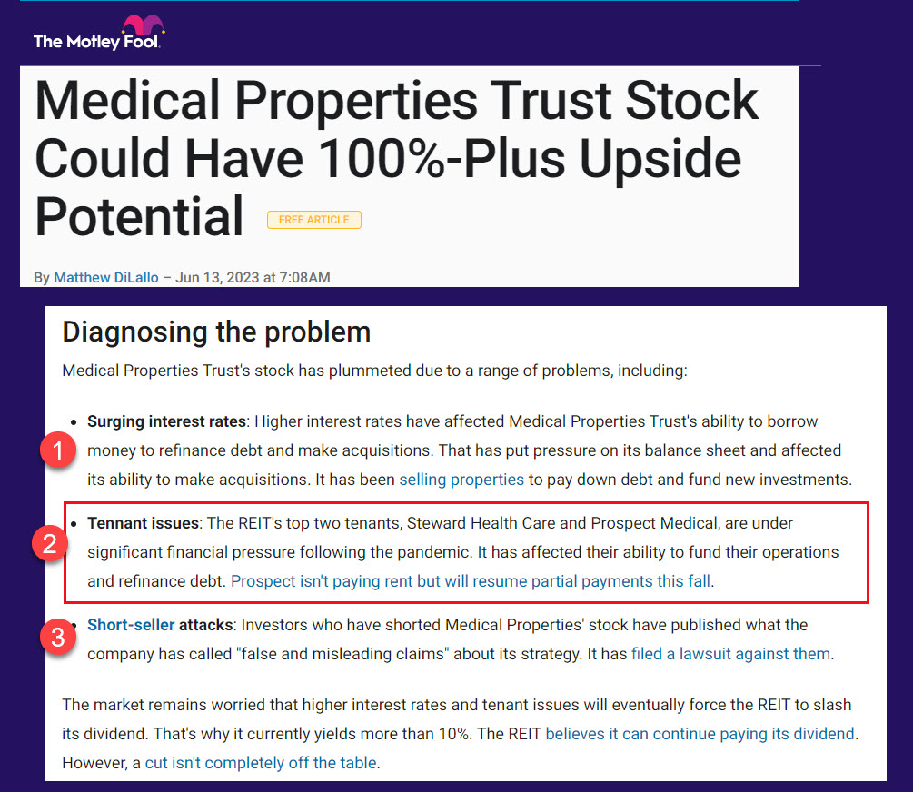 In general, I don’t listen to fools. However, “The Motley Fool” article by Matthew DiLallo on June 23 suggests that “Medical Properties Trust Stock Could Have 100%-Plus Upside Potential.” LINK