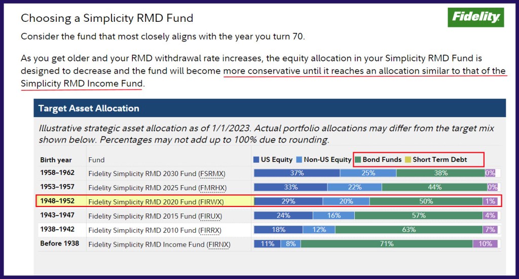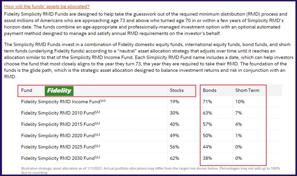 Here is Fidelity’s take on their RMD mutual funds: Fidelity’s Simplicity RMD Funds can: