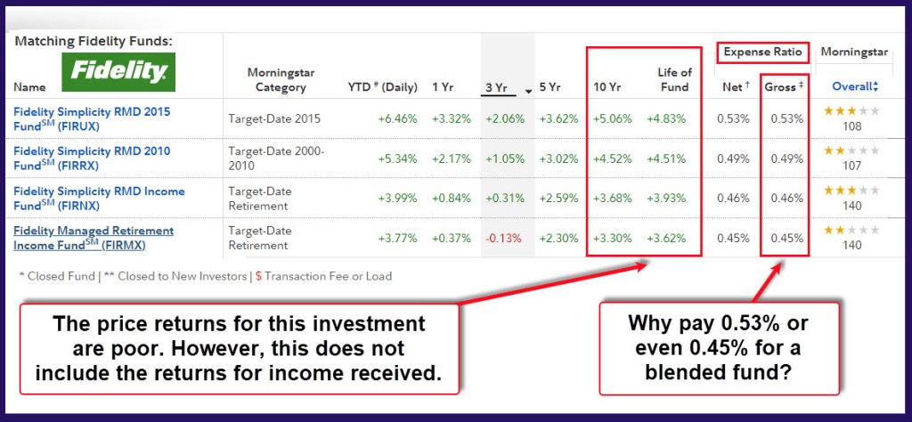 If you look at VYM’s ten-year total returns, you will see that they are 159.34%. Now look at the ten year returns for the four Fidelity Simplicity RMD mutual funds and weep.