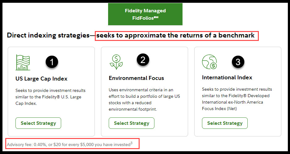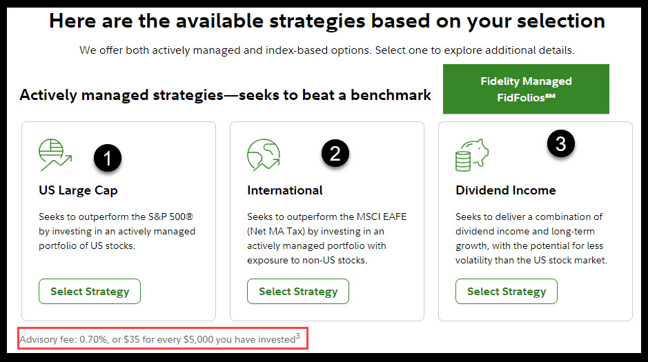 Fidelity has this to say, “Fidelity Managed FidFolios℠ strategies do not come with an advisor. All account activities, including opening your account and making updates to your preferences, take place online.” So the vanilla solution costs more the more money you have.