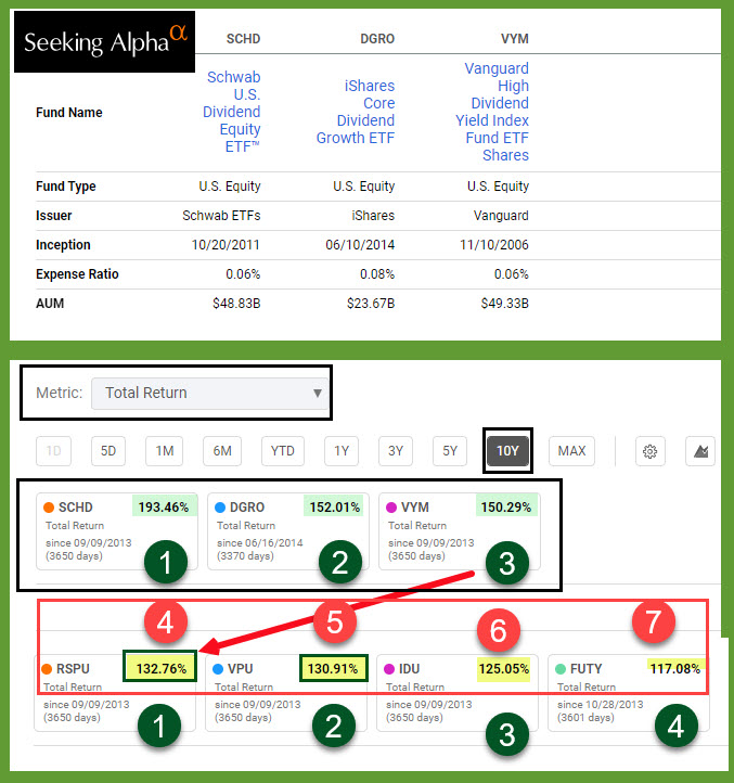 The ETF grades show a lot of red for VPU, IDU, FUTY, and RSPU. Compare those grades with SCHD, DGRO, and VYM. There is no comparison. My favorite ETFs win every time. As we move through this post, I think you will understand why this is so.