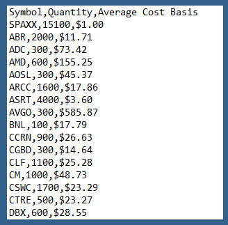 A csv file is a file with a series of columns and rows. The software identifies the columns with commas after each piece of data. This image shows the formatting of a portion of the data I downloaded from Fidelity as a csv file.