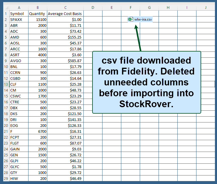 StockRover only needs a couple of columns of data. The required columns are the ticker symbol (like AVGO, or AAPL) and the number of shares you own. It is also helpful to provide the cost basis per share for some tasks. All three pieces of this information come in the csv file from Fidelity. I deleted the other columns of data. When I open the csv file in Excel, it looks like the following.