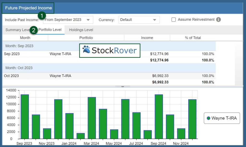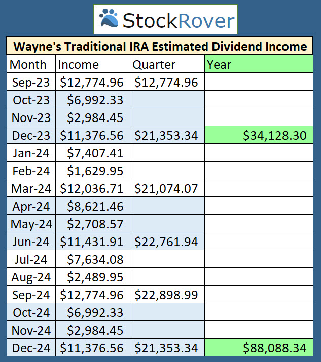 Sometimes the numbers are more useful. StockRover also allows you to download a csv file that shows you the monthly, quarterly, and annual income. In the case of the following image, the remaining 2023 “annual income” is $34,128.20. Next year’s annual income from my traditional IRA is projected to be $88,088.34.
