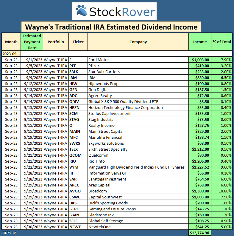 Far too many live life without a plan or a budget. Part of the problem is that income can vary from month to month. Therefore, the excuse I often hear is that “I don’t know what my income will be, because it varies, so I cannot create a budget.” In retirement this can also be a challenge. However, StockRover is one tool that can help with the budgeting process if you have dividend income. Today I uploaded a fresh version of my traditional IRA positions to StockRover and then used the tools in StockRover to look at my tax-deferred income for the next twelve months.