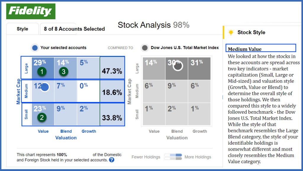 The purpose of this post was to help you think more critically about your investments. What are you trying to accomplish and achieve? If you are younger than 50 years old, then having a heavier weighting in growth stocks may benefit you in the long run. If you are retired, then having large-cap value stocks that pay a dividend can be a great way to keep income flowing into your checking account. Do you know what eggs are in your investment basket? If not, and if you are a Fidelity customer, take the time to find out if your investment mix matches your goals or not.