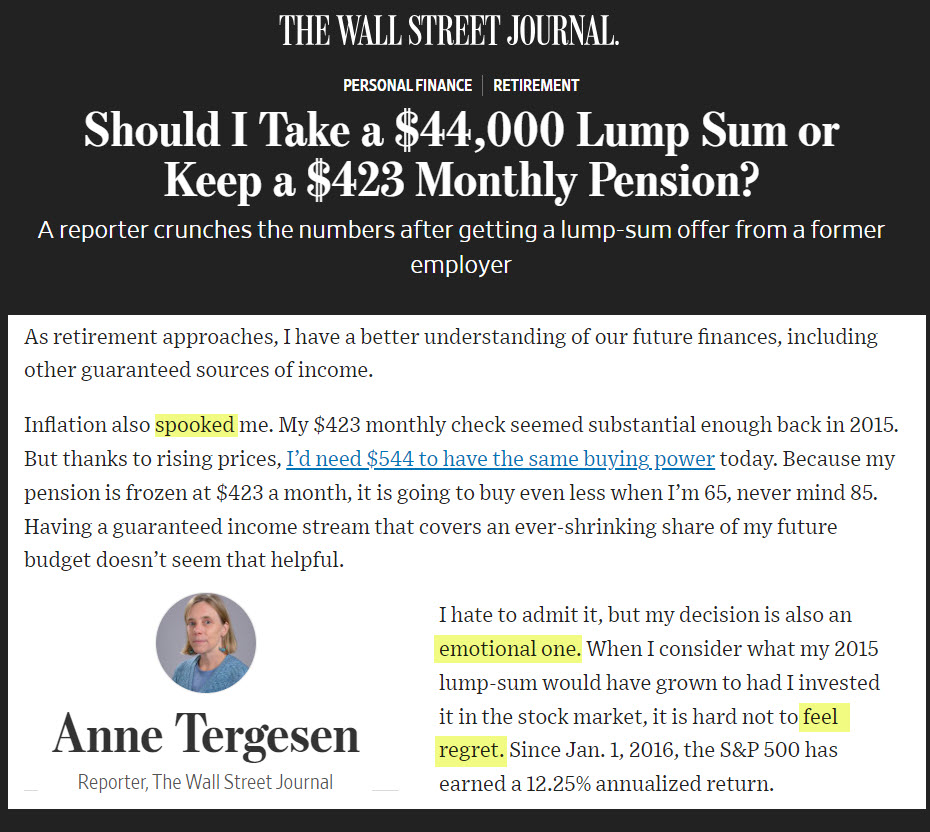One of the Wall Street Journal reporters I follow is Anne Tergesen. She wrote a helpful piece (September 23, 2023) about “Should I Take a $44,000 Lump Sum or Keep a $423 Monthly Pension?” I liked how she analyzed her situation and I think she made the right decision. I also appreciate something she said in the article: “I hate to admit it, but my decision is also an emotional one. When I consider what my 2015 lump-sum would have grown to had I invested it in the stock market, it is hard not to feel regret. Since Jan. 1, 2016, the S&P 500 has earned a 12.25% annualized return.” (1)