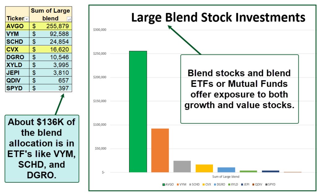 We don’t have a top ten. The focus is really on AVGO, VYM, and SCHD. The following graph shows the allocations. Bear in mind that large cap value is our largest style category, and small cap value is number two. So large cap blend comes in third place, and this is largely due to our sizable investment in AVGO.