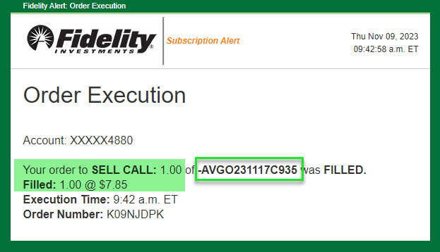 The last trade of the week had AVGO priced at $957.52 per share. The person who bought my covered call for $950 has the potential to make a profit if the shares remain above $950 through November 24. But if the share price drops, I get to keep my 100 shares and the options income. If the shares are called away, that is also to my advantage in two ways. One, it reduces my holdings in AVGO. I currently have 16% of my traditional IRA in AVGO. That is far more than I would generally recommend. It is also 9.9% of our total investments at Fidelity. So a sale of one third of our shares reduces our risk.