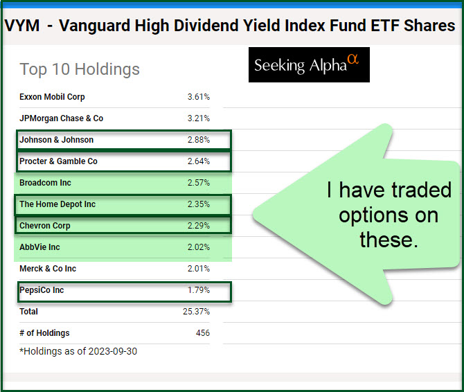 Most of the top ten investments in many ETFs can be traded as covered call options. A quick review of VYM’s top ten shows the companies that make up one-fourth of VYM’s total holdings are Exxon Mobil Corp, JPMorgan Chase & Co, Johnson & Johnson, Procter & Gamble Co, Broadcom Inc, The Home Depot Inc, Chevron Corp, AbbVie Inc, Merck & Co Inc, and PepsiCo Inc. I currently own shares of AVGO (Broadcom), CVX (Chevron) and ABBV (AbbVie). For all ten you can trade options. The average person is probably not going to want to buy 100 shares of AVGO, because at the current market price that would cost $95,752. However, CVX is far more affordable at $14,295 for one hundred shares.