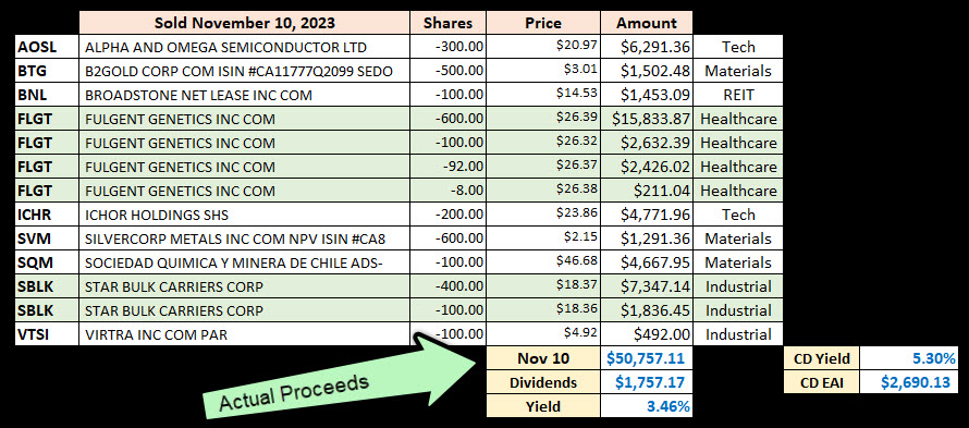 Friday I sold the following investments: Alpha and Omega Semiconductor, B2Gold Corp, Broadstone Net Lease Inc, Fulgent Genetics Inc, Ichor Holdings, Silvercorp Metals Inc, Sociedad Quimica Y Minera De Chile ADS, Star Bulk Containers Corp, and Vitra Inc. This caused me to book a loss of just over $100,000. Ouch! The true loss is less than $100K. I received over $16K in options income from these positions and $3,294 in dividends.