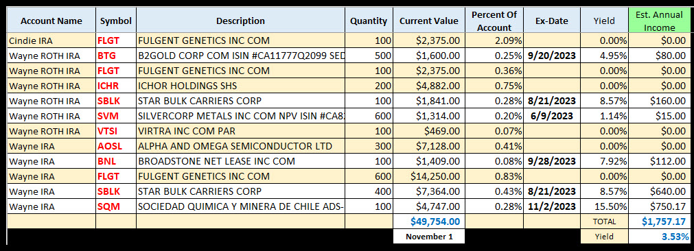 On the plus side, the estimated annual dividends from BNL, BTG, SBLK, SVM, and SQM were only $1,757. So around $18K of investment dollars were earning a dividend. Over $31K were not earning a dividend. I did not take the time to review the dividends I have received from these positions, but the dollars weren’t enough to satisfy me to hold these for the long term. In addition, the potential income from trading options on these was not a compelling reason to hold.