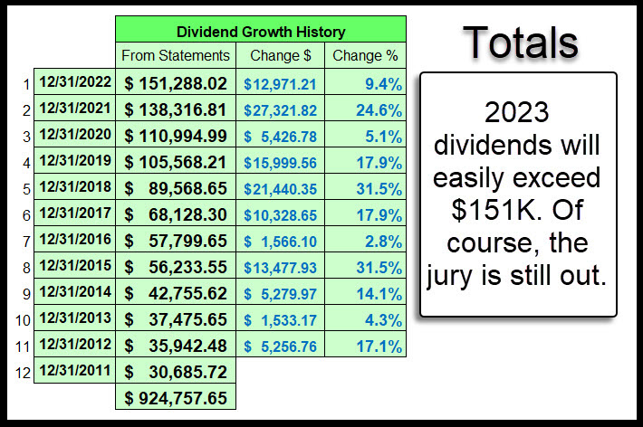 It is very likely that our 2023 total dividend income will exceed that of 2022. The following image shows what my easy income strategy has produced since 2011. Bear in mind that I have been “retired” for over ten years. Therefore, the growth in our income is better than most of the raises I received in my working years. For example, how many of you got a 24.6% increase in 2021? How about 31.5% increases in 2018 or 2015?