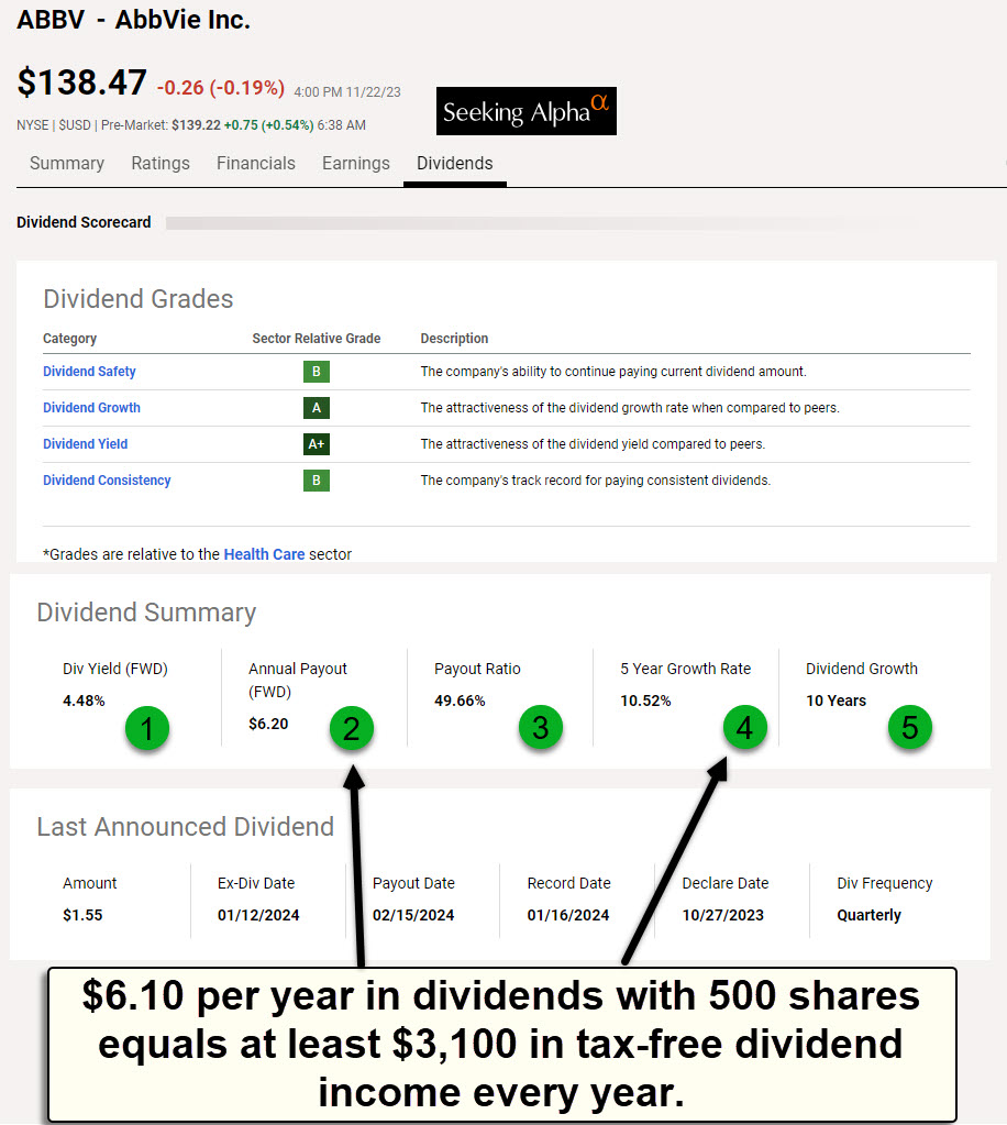 Those shares are now worth 138.47 per share, or $69,235. In addition, I have received $12,058 in dividends that will never be taxed. But it doesn’t end there. I have also received $1,556 in covered call options premiums. So my initial tax liability on about $39K has given me tax-protected benefits of $82,849. That is a real deal. And the real deal keeps giving year after year.