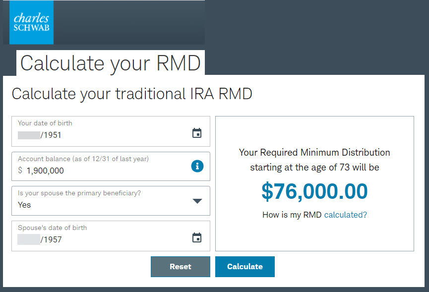 In a future post, or posts, I hope to be able to explain what I did and why I did it. I also plan to share some links for various resources applicable for those who are interested in their own tax situation. Schwab provides a free useful RMD tool. LINK