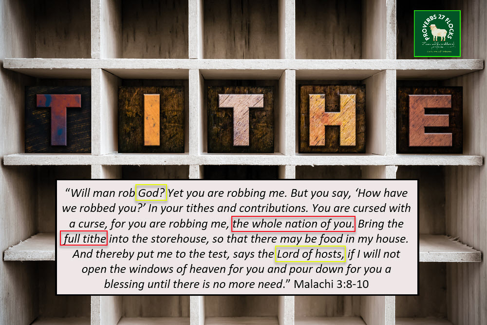 “Will man rob God? Yet you are robbing me. But you say, ‘How have we robbed you?’ In your tithes and contributions. You are cursed with a curse, for you are robbing me, the whole nation of you. Bring the full tithe into the storehouse, so that there may be food in my house. And thereby put me to the test, says the Lord of hosts, if I will not open the windows of heaven for you and pour down for you a blessing until there is no more need.” Malachi 3:8-10