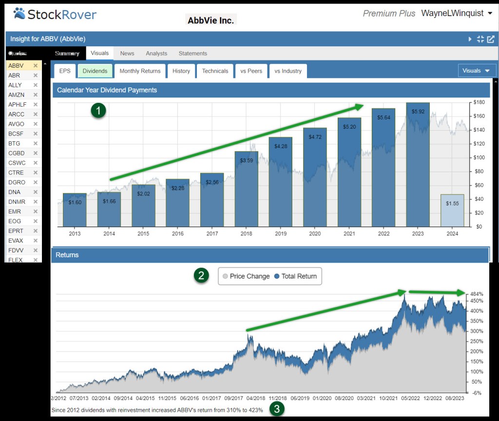 I like several things about this tool. It makes it easier to see important information about our investments. For example, I own shares of ABBV. There are two ways StockRover helps me see the value of this investment over time. One is a dividend growth graph. Another is a total returns perspective. Both are important.