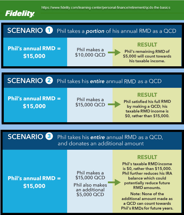 “A qualified charitable distribution (QCD) is a direct transfer of money from an IRA to a 501(c)(3) charitable organization that is eligible to receive tax-deductible contributions.” Fidelity Investments