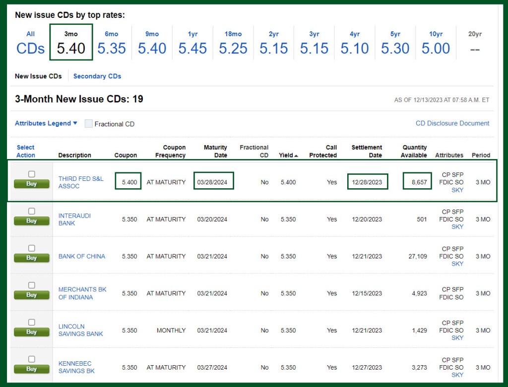 One final word of caution for the nervous readers. If you buy a CD for $1,000 and then you see it drop to $999.54 (as in the following real-life example), don’t be alarmed. That has no bearing on the value of your CD at maturity. That is only the amount someone else is willing to pay you to buy your CD. If you hold the CD to maturing, you get your $1,000 back and the interest.