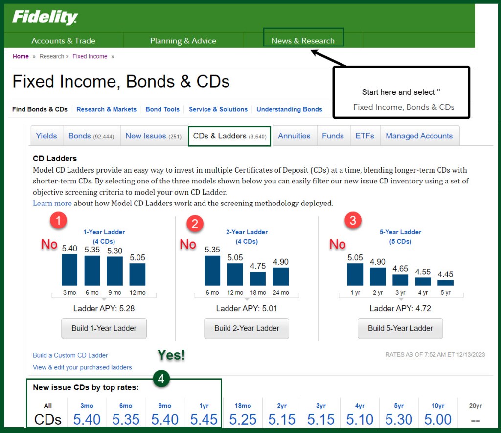 The next two images show some highlights from Fidelity’s CD choices. I generally dislike CD Ladders, as the normal choices include CDs that have a one-year duration. It is far better to buy your own CDs and create your own “ladder” of CDs that expire gradually over time.