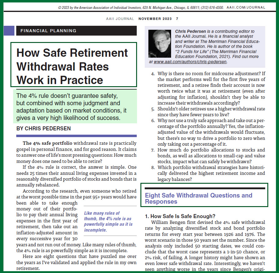 In the November 2023 AAII Journal Chris Pedersen, a financial analyst and writer at the Merriman Financial Education Foundation, wrote an article titled “How Safe Retirement Withdrawal Rates Work in Practice.” What he discussed applies to the question at hand. The article includes “Eight Safe Withdrawal Questions and Responses.” I want to draw some main ideas from the article in a more summarized fashion. We will look at two of Pedersen’s eight questions.
