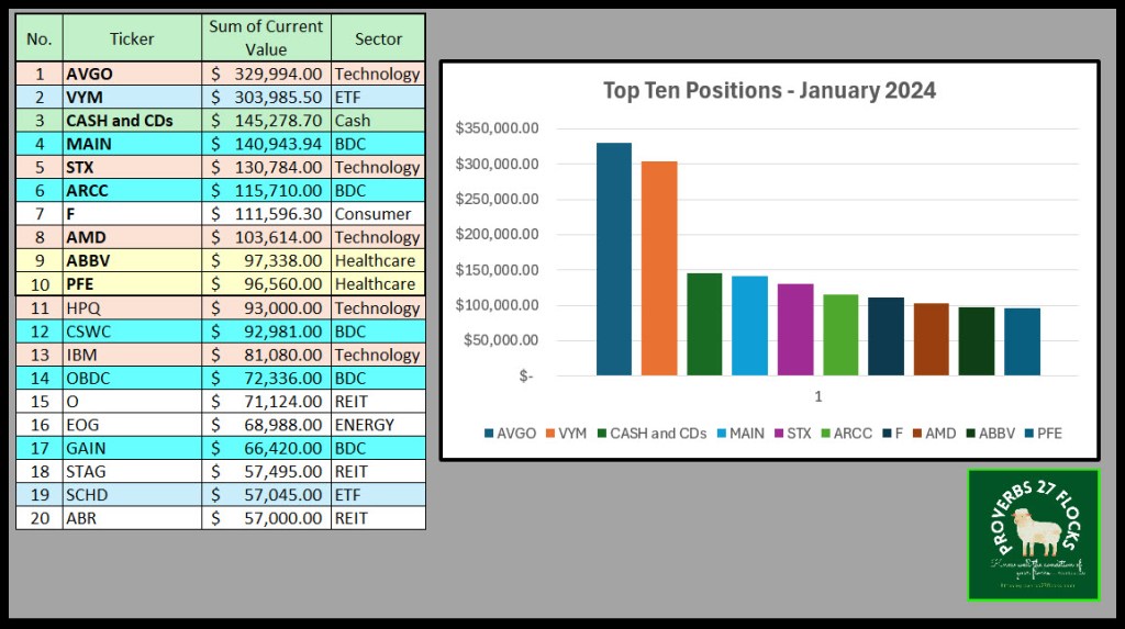 The current top ten include: ticker symbols AVGO, VYM, CASH and CDs, MAIN, STX, ARCC, F, AMD, ABBV, and PFE. I have a focus on VYM, technology-related investments and BDCs. In the top ten the dollars invested are: Technology ($564K), ETF ($304K), Cash ($145K), BDC ($257K), Consumer ($111K), and Healthcare ($194K).
