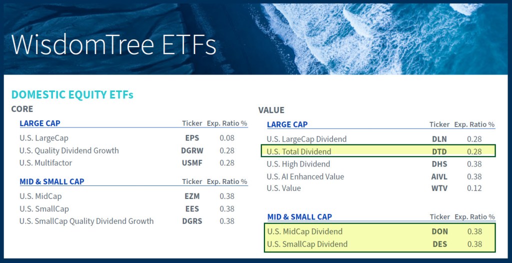 DTD isn’t the only opportunity. There is also DES and DON. DES is the WisdomTree U.S. SmallCap Dividend Fund ETF and DON is the WisdomTree U.S. Mid-Cap Dividend Fund ETF.