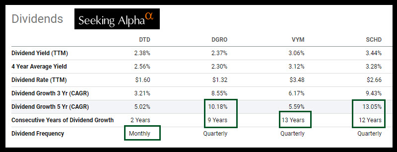 While it is true that DTD has a higher expense ratio, I am OK with a bit more of an expense ratio if it is less than 0.30% or if there are compelling reasons for the ETF’s unique positioning. Part of the reason for DTD is that there are a larger number of holdings. I am also willing to accept a slightly higher expense ratio for the monthly dividend. I have to believe the ETF managers have a bit more work to do to make the dividend a monthly goal.