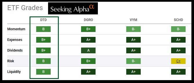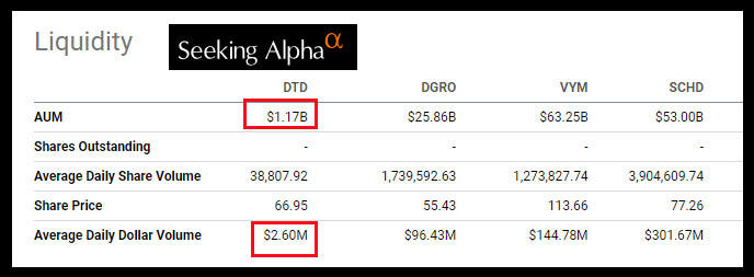 Also, DTD is thinly traded. This means that on any given trading day, relatively few shares are bought and sold. DTD has an average daily dollar volume of only $2.6 million, where DGRO, SCHD, and VYM are more actively traded. For long-term investors, this is less of an issue, but it also means you won’t be able to grab shares at a price much below the current price.