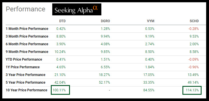 Both of these also offer monthly dividends. DON’s ten-year returns are 78.68%, which isn’t terrible, but it isn’t as good as DTD. DES is even worse, at 39.23%.